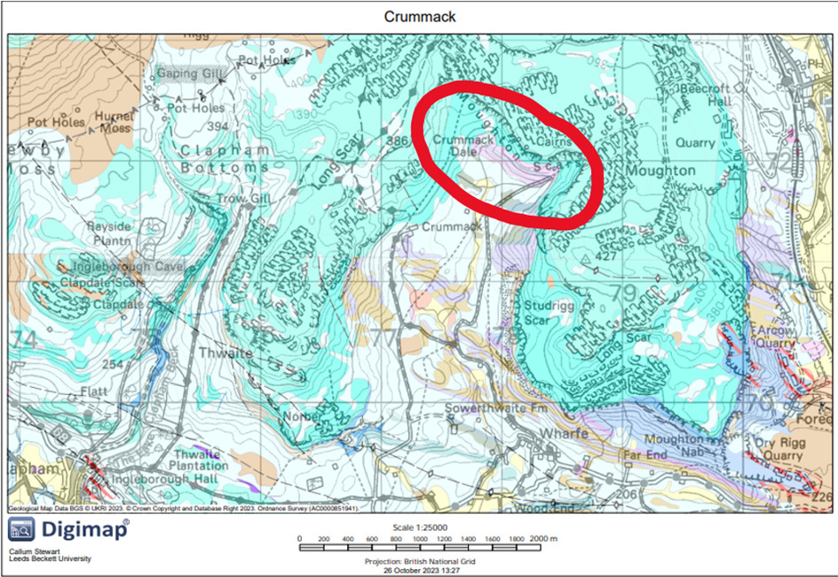 The Norber Erratics have a lithology of Greywacke, which is very different from the limestone bed on which they now rest. When looking at the underlying lithology of the region, the point marked by Crummack Dale, highlighted in red in Figure 10, stands out as having a section layer of the Gerywacke on the south side of the hill. This would align with the data I obtained on the boulder’s fabric and alignment, indicating that it was transported approximately 1 mile to its current location. This indicates that the ice flowed very uniformly towards Austwick.