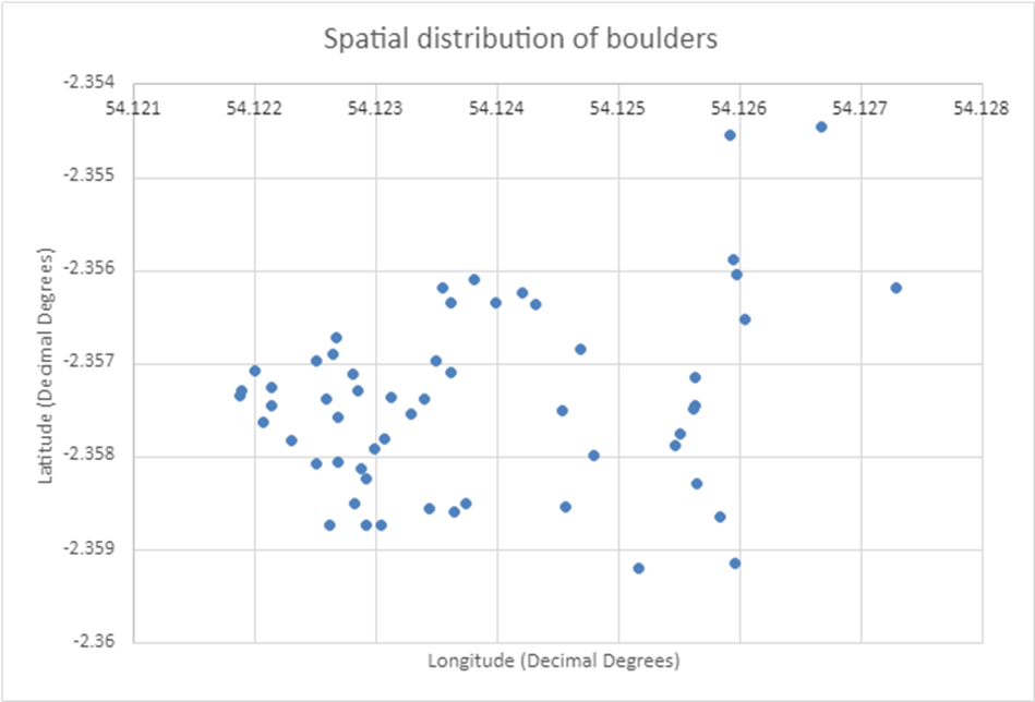 Spatial distribution of boulders: using a GPS at each of the measured boulders to plot the GPS coordinates onto a grid to showcase the distribution of each one. The distribution of boulders provides a clear visual representation of the study area and the number of samples, enabling the creation of a specialised distribution graph that aids data analysis.
